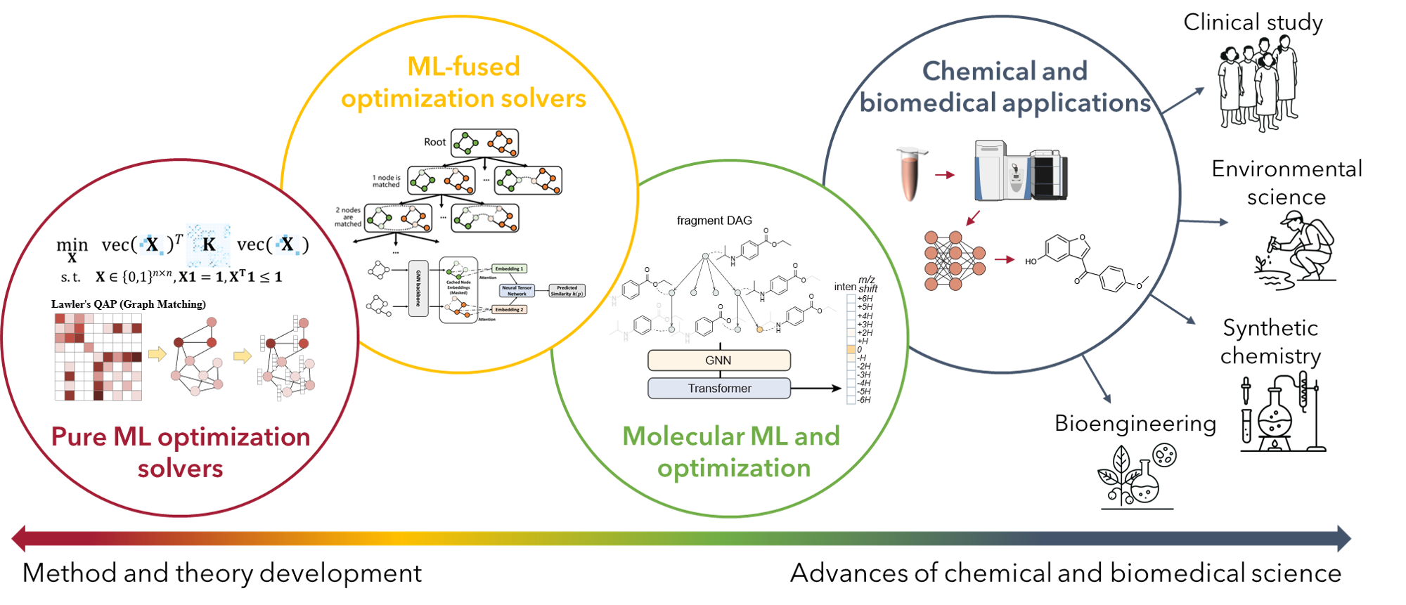 My research aims at bridging theory and method development in machine learning and optimization to chemical and biomedical applications. As an ongoing focus, I am interested in developing machine learning–based structural elucidation models for metabolomics.